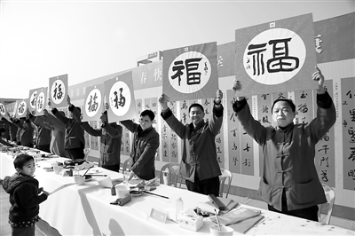 1月18日下午,来自海峡两岸的百名书法家身着酒红色唐装,齐聚厦门市五一文化广场,共同挥毫泼墨,同时开笔书写“福”字和“春”字,寓意百“福”迎“春”,书法家们将书写的春联作品赠送给百名劳模。