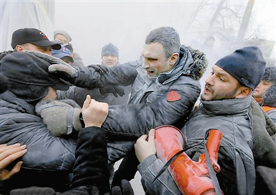 在乌克兰首都基辅,大批示威者在距政府和议会大厦仅百米之遥的格鲁舍夫斯基大街北口与警方发生冲突。亲欧党派领袖、前重量级拳王冠军克里钦科在试图阻止冲突。