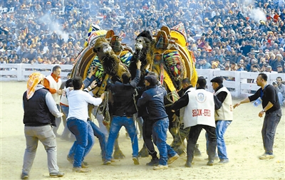 当地时间1月19日,在土耳其伊兹密尔,一年一度的骆驼节在爱琴海沿岸古镇赛尔丘克举行,数百只骆驼前来参加摔跤比赛。阿健 供图