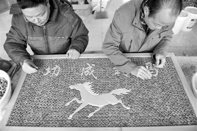 2014年1月19日,在浙江省临安市一家工艺品公司的生产车间,工人在修饰赶制好的马年画匾。随着农历马年脚步的临近,以废弃空籽山核桃为加工原料的浙江省临安市工艺品公司,忙着赶制客户定制的木雕画匾、屏风、笔筒等工艺品,满足海外市场需求。
