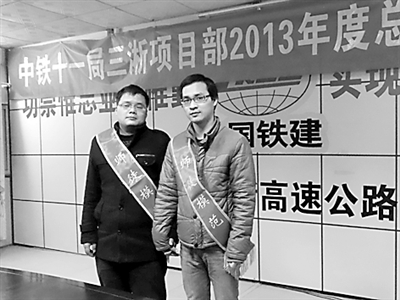 1月20日,工程部副部长兼桥梁工程导师吕育春和桥梁工程技术员、徒弟李想,戴上“师徒模范”的绶带后合影留念。