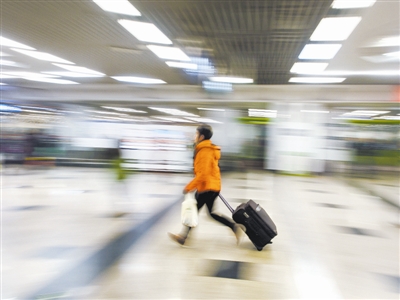 1月21日,北京,大批春运旅客由地铁9号线到达北京西客站,在走出地铁闸口之后,不少携带着各式箱包的旅客加快脚步,飞奔向车站赶车。