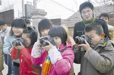 1月19日,在山东省聊城市军王屯村,几名小朋友在学习摄影技术。当日,山东聊城大学化工学院9名大学生“寒假爱心服务队”成员携带照相机来到经济技术开发区军王屯村与10多名村里的孩子开展了寒假儿童快乐学摄影活动。寒假中的孩子们在快乐中增长了知识,体验摄影的乐趣。