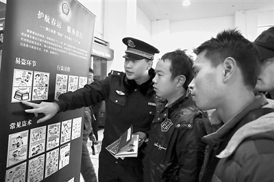为保障旅客群众春运期间能够平安、方便、温馨出行,1月16日,杭州铁路公安处在杭州火车站、杭州火车东站举行了以“护航春运、服务出行”为主题的宣传活动。活动中,该处民警根据火车站、列车上常见的盗窃、诈骗及假票等案件,设计了防盗、防骗漫画书“铁警漫说”,并对现场旅客进行宣传讲解。图为民警向旅客讲解防盗、防骗漫画内容。