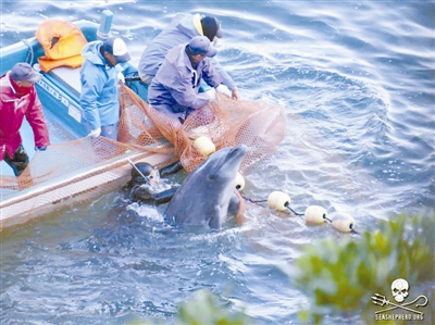 很快,日本渔民发明了捕捉海豚的方法。他们先在海中放置一些钢铁长管并不断敲打,以此扰乱海豚的声纳系统并使它们受到惊吓。随后,渔民会把海豚赶到一些由岩石建成的凹口内,再将入口用渔网封锁,这样海豚就任由处置了。利用这种方法,平均每年大概有2.3万条海豚被日本渔民捕杀。