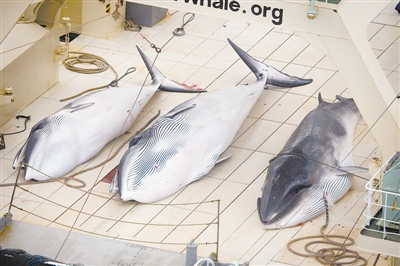 海洋守护者协会近日公布的三条死亡的小须鲸在一艘日本船上的照片。东方IC 供图