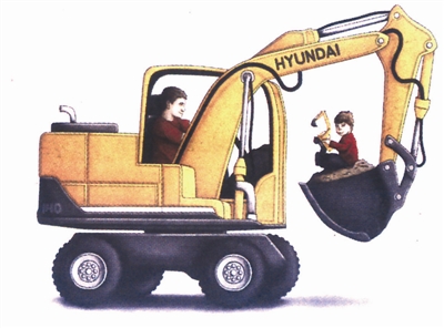 父亲为了让孩子尽享玩具的愉悦,不顾操作规章,任其爬上铲车翻斗折腾,溺爱,真是危险哪!马 铁(匈牙利)