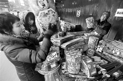 1月25日,北京,一位店主向顾客推荐无纸屑的环保烟花。市政府烟花办新规提醒各网点,在空气重污染预警一级(红色)或二级(橙色)期间,临时禁放。曹博远摄/CFP