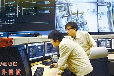 监控中亚及中缅管道的海外调度台上,调度人员段昆华与卫续正在交接班。