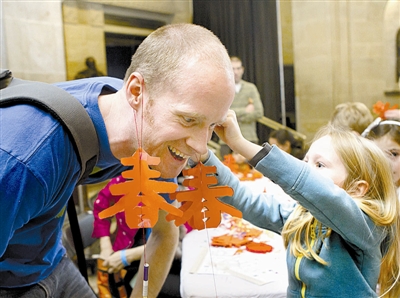 1月25日,在加拿大多伦多的皇家安大略博物馆,一个女孩将自己的手工作品挂在爸爸的耳朵上。