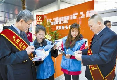 2014年春运期间,天津火车站在退休职工中招募身体健康、经验丰富的老职工,组建“夕阳红春运志愿服务队”,在天津站的候车大厅、站台等区域为旅客提供引导、答疑、帮扶等服务。 新华社发(杨宝森 摄)