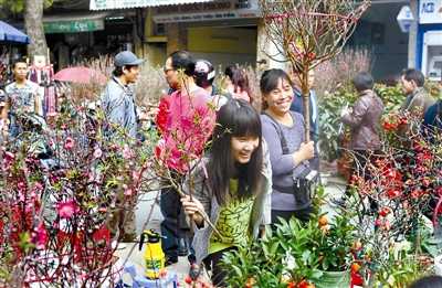 每逢春节来临之际,越南民众会到花市购买桃花枝摆放在家里,以求新年好运。