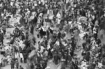 1月27日,在浙江杭州四季青服装批发市场,服装市场大楼前的广场空地上挤满了商户和购物者。即将春节放假,四季青服装市场的商户们开始对商品“清仓甩卖”处理,来清理库存,周转资金。由于折扣非常低,众多杭州市民纷纷前来,大包小包地购买廉价的服装。