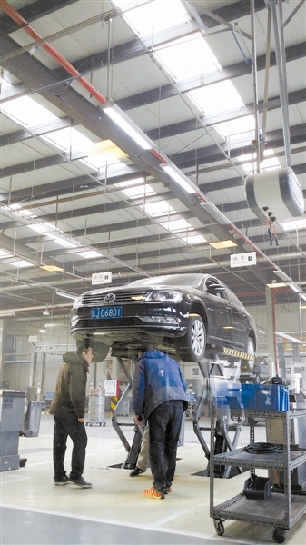 左图:在位于北京南四环的一家一汽大众4S店内,近段时间以来进店咨询购车的顾客并不多,大多数顾客都是来进行汽车维修和保养的。自驾返乡过春节路途遥远,出发前保养检查汽车做到安全第一。