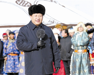农历马年来临前夕,中共中央总书记、国家主席、中央军委主席习近平冒着严寒来到内蒙古锡林郭勒草原看望慰问各族各界群众。在冬季那达慕活动现场,习近平在为当地牧民祈福时,向全国各族人民、港澳台同胞、全球华人华侨拜年,致以新春祝福。