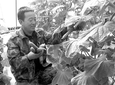 春节期间,河北省宽城满族自治县金杖子村温室蔬菜大棚内,村民忙着采摘蔬菜销往北京、天津等地的商场超市。近年来,全村借助县里扶持发展循环农业的优惠政策,开始有机蔬菜种植,并组建了蔬菜专业合作社抱团闯市场。图为金杖子村一村民在采摘黄瓜。
