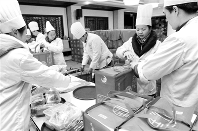 1月29日,苏州一些“老字号”餐馆、饭店的工作人员开始为第一批领取半成品“打包年夜饭”的市民集中配菜打包,让市民在家中就能吃到美味可口的年夜饭。这种既节俭又方便的“打包年夜饭”,分为不同套餐,每款套餐包括不同数量的冷菜、热菜、甜点等,价格相当于在餐馆吃一顿相同规格年夜饭的60%至70%,颇受消费者青睐。王建中 摄