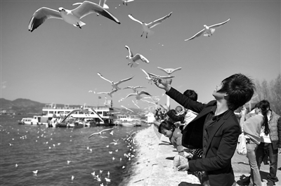 2月6日,市民在昆明滇池草海大坝给红嘴鸥喂食。