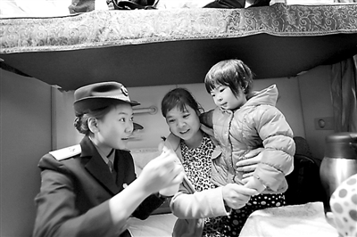 春运开始以来,全国列车推行各种便民利民举措,为乘客提供温馨、优质、便捷的旅行服务。北京开往龙岩的K571次“红古田号”列车上,乘务员为旅客提供便民服务。赵晶 摄
