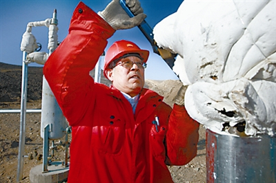 所谓“土办法”,就是回到站上拖上一桶热水浇到管道上。等老郑解决了冻堵,已是中午时分。虽是严冬,才得空在原地站立休息会儿的老郑已是满脸汗珠。“每天从早到晚都在井上,时间久了都有感情了,像孩子一样,一会儿不看看,心里就憋得慌。”