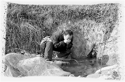 经过一个小水凼,里面有几根管子。“那根粗管是把山上的泉水引到这里,再通过这些细管把水引到老乡家里。”宝哥蹲下身子捧了口泉水喝,美滋滋地招呼记者一起享受这纯天然的矿泉水,“这里没有自来水,泉水挺好喝的,你尝尝!”