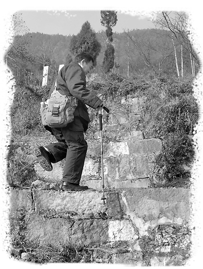 刚爬了没多远,就遇到了一处荆棘丛生的堡坎,宝哥在前面用拐杖开道,一路披荆斩棘,但枝杈和尖刺还是防不胜防,记者的衣服被刺了些小洞。“2008年这条管线刚建好的时候有通道,这几年树木长出来把一些通道盖住了,衣服、脸上手上被刮破就成了常事。”