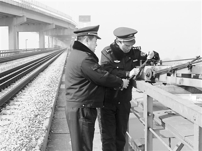 春运期间,芜湖铁路警方加大路面警力投入,切实落实各项安全措施,加强对铁路桥梁上桥旋梯锁闭设备、桥面设施设备、治安岗亭设备配备情况的安检。图为铁警对芜湖长江大桥开展全覆盖式安全检查的情形。