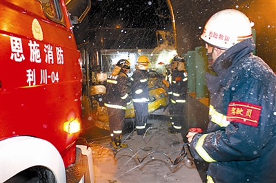 2月9日凌晨,消防官兵在沪渝高速利川段利川往恩施方向岩湾隧道入口处的车祸现场施救。