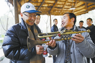 重庆南岸区迎龙镇北斗村“农民管乐队”的队员,正在向艺术家展示自己维修多次的乐器。