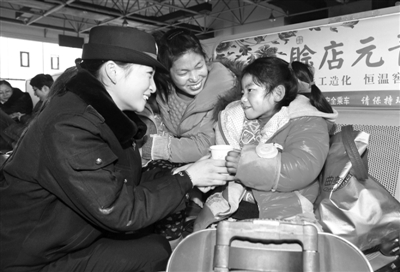 春运期间,南阳车务段在客运岗位推广以“诚心对待旅客,热心解答旅客咨询,爱心帮扶特殊群体,细心对待本职工作,用心落实服务标准,虚心对待表扬批评”为内容的“六心”工作法,努力为旅客打造温馨便捷的出行环境。图为南阳站工作人员为候车小旅客送开水。 郭永林 摄