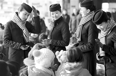 2月10日,在兰州火车站,参加结对交流的空姐们正在候车大厅内为旅客服务。