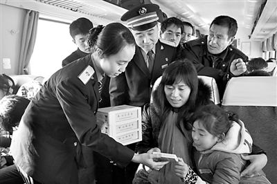 今年春运中,太原铁路局太原客运段推出多项便民措施,确保广大旅客安全、方便、温馨出行。图为太原开往杭州的K908次列车乘务员正热情为患病旅客服务。杨东 摄