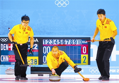 2月10日,中国队队员刘锐(中)、巴德鑫(右)和臧嘉亮在比赛中。当日,在索契冬奥会男子冰壶比赛中,中国队以7比4战胜丹麦队。新华社记者 龚兵 摄