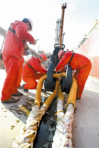 洋口港江苏LNG(液化天然气)接收站码头,水手长冯军和同事提前近两个小时就来到现场,虽然前一天已经检查完毕,但还是要再次检查,确保大型LNG船顺利停靠接卸。