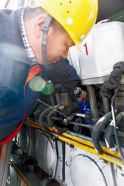 春节期间,宁夏宁东铁路公司检修人员放弃与家人团聚,坚持工作在一线。图为该公司员工正在检修机车,为公司安全生产保驾护航。 高海燕 摄