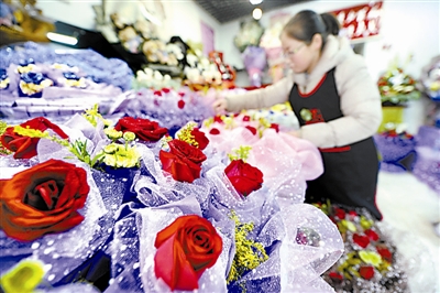 2014年我国的传统节日“元宵节”与西方“情人节”恰逢同一天,随着节日临近,宁夏银川各个花店生意红火,订单不断。