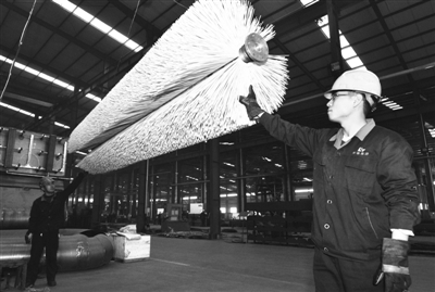 2012年11月,中国企业并购曾上演“乡镇企业并购海外大集团”的壮举:山东邹平县乡镇企业开泰集团并购荷兰Airblast B.V公司。图为开泰集团工人在吊装滚刷组装清洗机械。