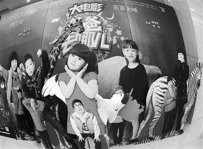 2月3日,湖北宜昌万达电影院,《爸爸去哪儿》电影海报吸引观众合影。刘君凤/东方IC