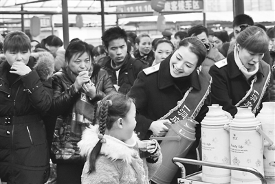 2月7日以来,湖南地区迎来大范围雨雪天气,岳阳火车站的春运志愿者为乘坐春运列车的旅客送上热气腾腾的红糖姜茶,为风雪中的旅客送上了早春的温暖。赵敏 袁钢摄
