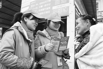 志愿者王秀梅正与同伴用苗语帮助一位苗族老大娘购票。姜泽鹏摄
