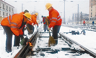 2月9日,江西省38个县市迎来马年第一场降雪。南昌铁路局迅速启动应急预案,数万名干部职工顶风冒雪进行作业并对线路、道岔等重要区段开展除冰扫雪。