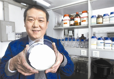2月13日,中科院上海硅酸盐研究所朱英杰研究员在展示他所带领的科研团队研发的“耐火纸”。