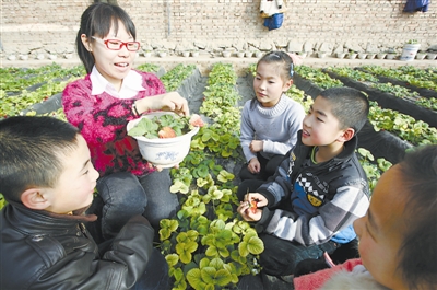 2月12日,大学生村官费璠带留守儿童在大棚观察草莓的生长。