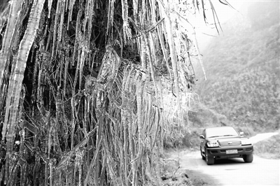 广西多地近日的降雪冰冻天气造成道路结冰等安全问题,但也形成了冰挂等在当地少见的冰雪景观。图为桂林全州县蕉江瑶族乡的一乡村公路旁挂满冰凌的景观。