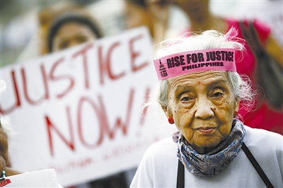 当地时间2014年2月12日,菲律宾帕赛,二战期间被迫充当慰安妇的菲律宾老人在日本大使馆外集会,要求日本政府对慰安妇问题正式道歉并给予赔偿。CFP供图