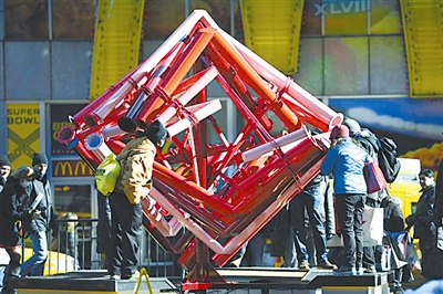2月10日,参观者在美国纽约时报广场欣赏情人节雕塑。这座雕塑通过十二个观望点,用复杂、对称等特殊设计,让观众以星座的原理,通过潜望镜去寻找属于自己的“另一半”。新华社记者 王雷 摄
