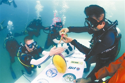 2月11日,在泰国董里府克雷登岛,水下证婚人(右一)在海里为一对新人主持传统泰式婚礼。为迎接即将到来的情人节,泰国董里府11日为来自英国、法国、中国等5个国家的32对新人举办了别具特色的海底婚礼。董里府海底婚礼1997年创办,2000年曾打破吉尼斯世界纪录,荣获“世界最大水下婚礼”的称号。 新华社发