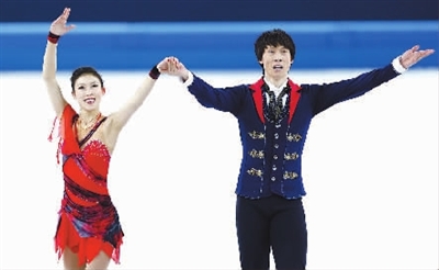 2月12日,在索契冬奥会花样滑冰双人滑比赛中,中国选手庞清/佟健以209.88分的成绩获得第四名。图为赛后两人深情谢幕。新华社记者 王丽莉 摄