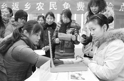 为了提升流动农民工育龄妇女的健康保健意识,江苏省东海县利用春节期间大量外出务工人员返乡之际,以出动宣传车、设立咨询台、免费体检等多种形式,深入到全县17个乡镇、2个街道办346个行政村、居委会,为返乡农民工开展免费健康体检和自我保健知识宣传。