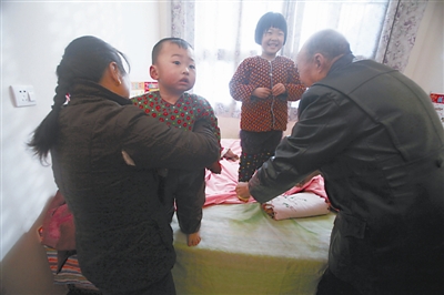 1月29日,陈乖文和老伴在家给刚刚午睡醒了的两个孙子穿衣服。